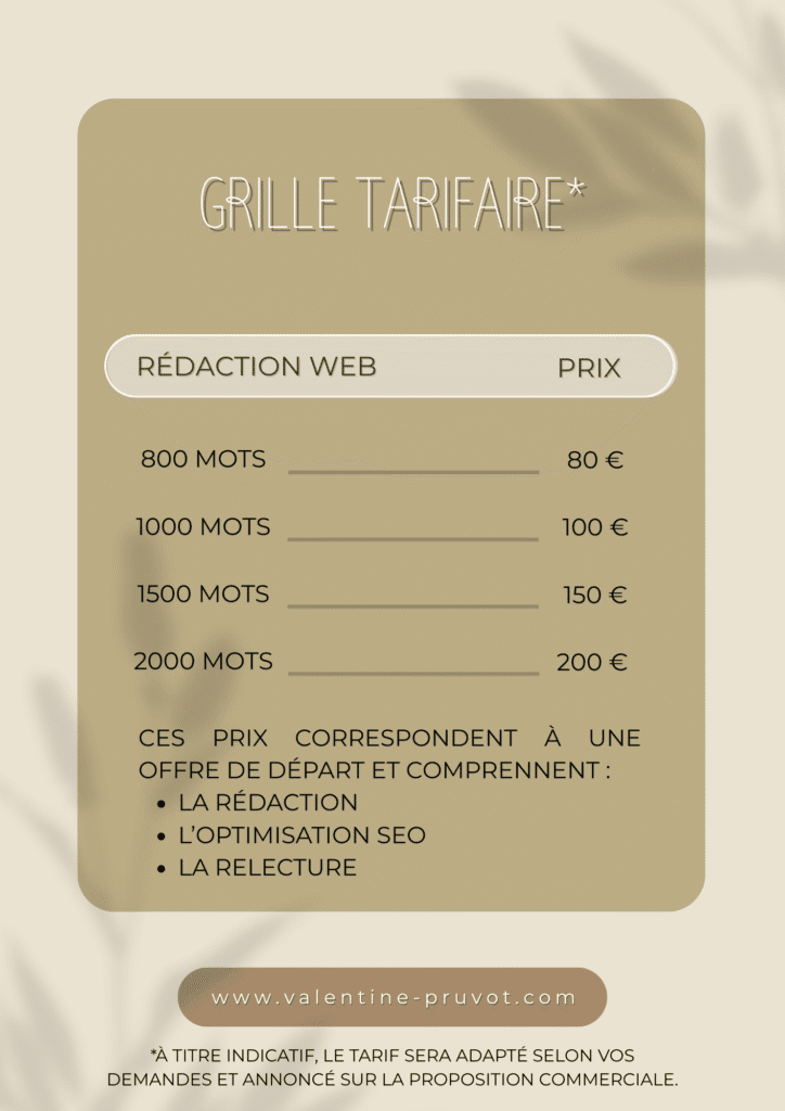 J’adapte le tarif selon la demande. Le nombre de mots compte, mais pas seulement ! Le type de projet, le temps de recherche, l’insertion d’image, la proposition d’une stratégie éditoriale, l’intégration du contenu directement sur votre site… Autant de paramètres qui modifient les heures passées à travailler avec rigueur sur vos projets. Et toute heure travaillée mérite salaire, n’est-ce pas ? 🙂